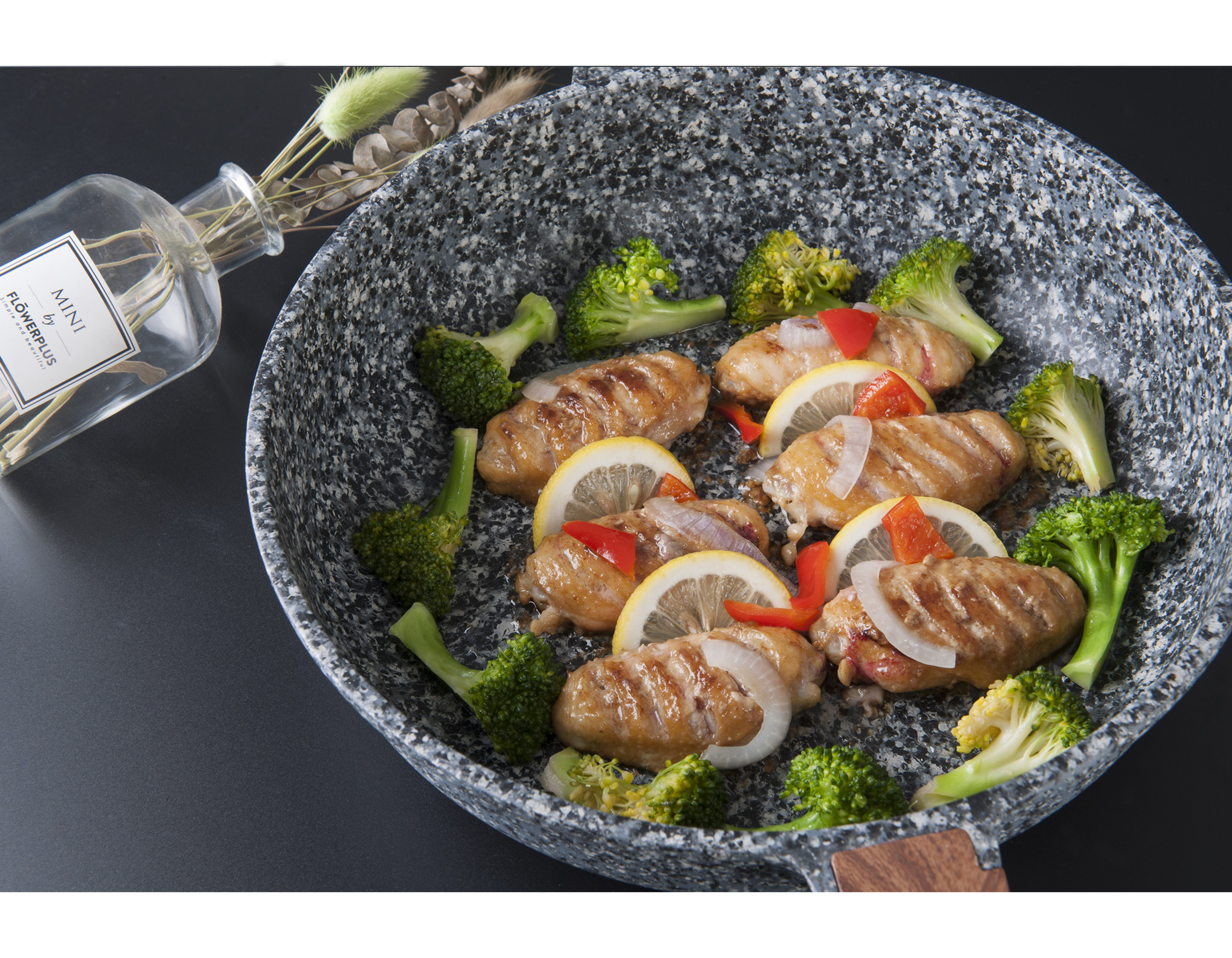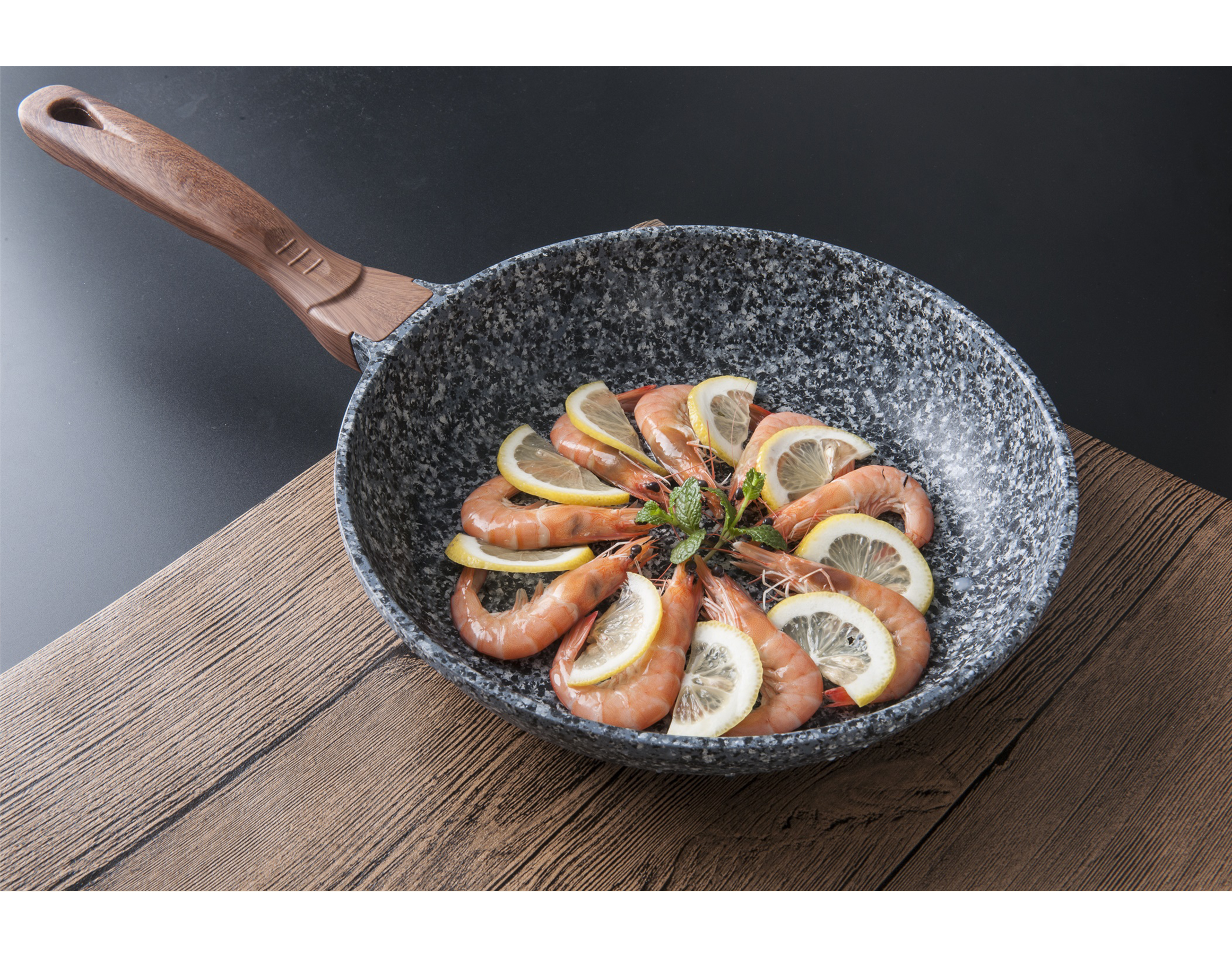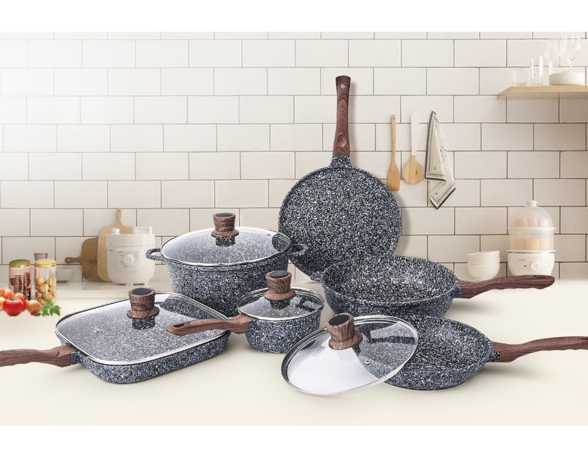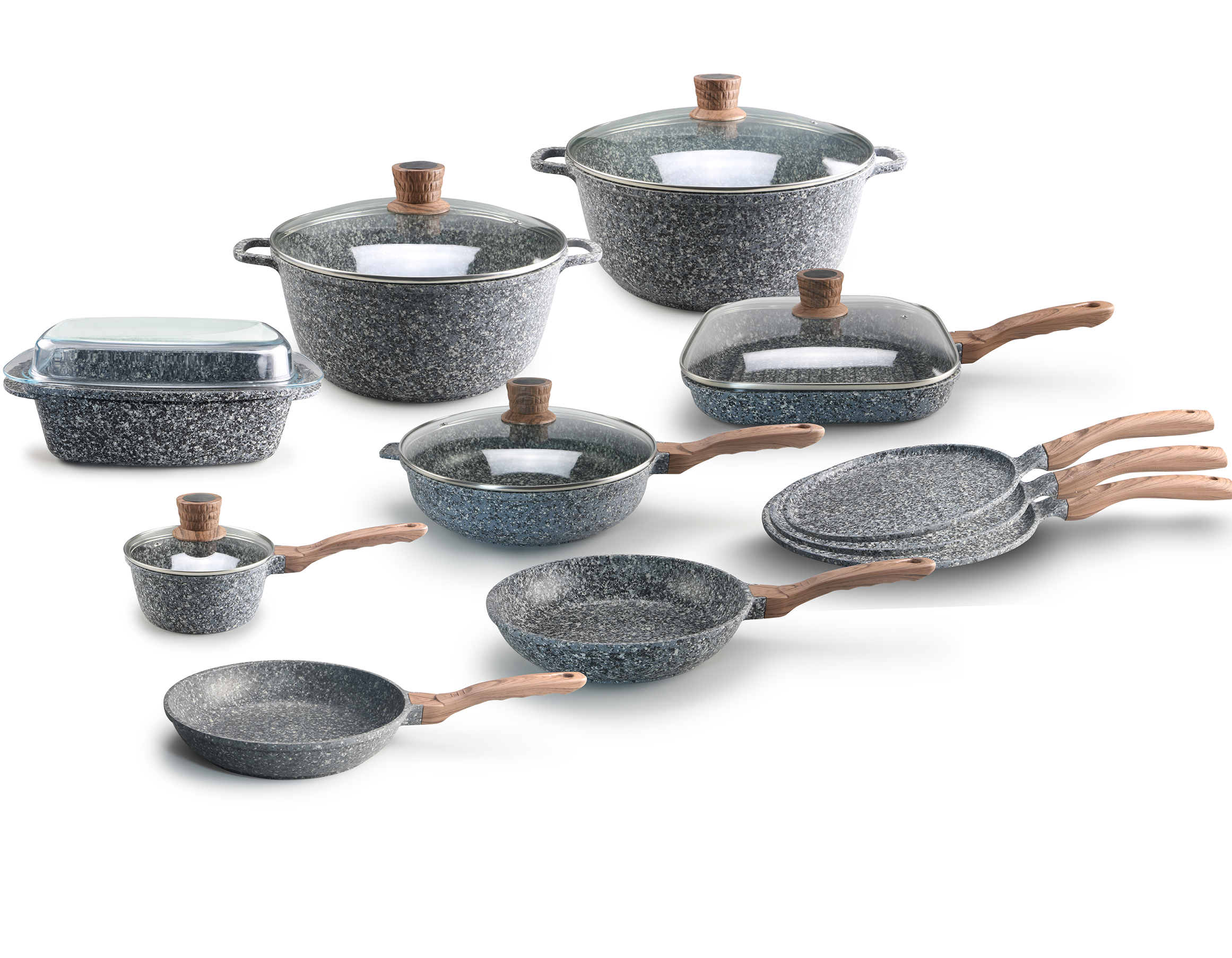 This comprehensive cookware set features a premium granite non-stick coating and includes a sauce pan, casserole, fry pan, deep fry pan, grill pan, and pizza pan—covering every cooking need from sautéing to baking. Each piece is crafted from durable die-cast aluminum with a standard encapsulated induction base, ensuring even heat distribution and compatibility with all stovetops. The natural granite finish delivers both style and performance, making it the perfect addition to any modern kitchen.