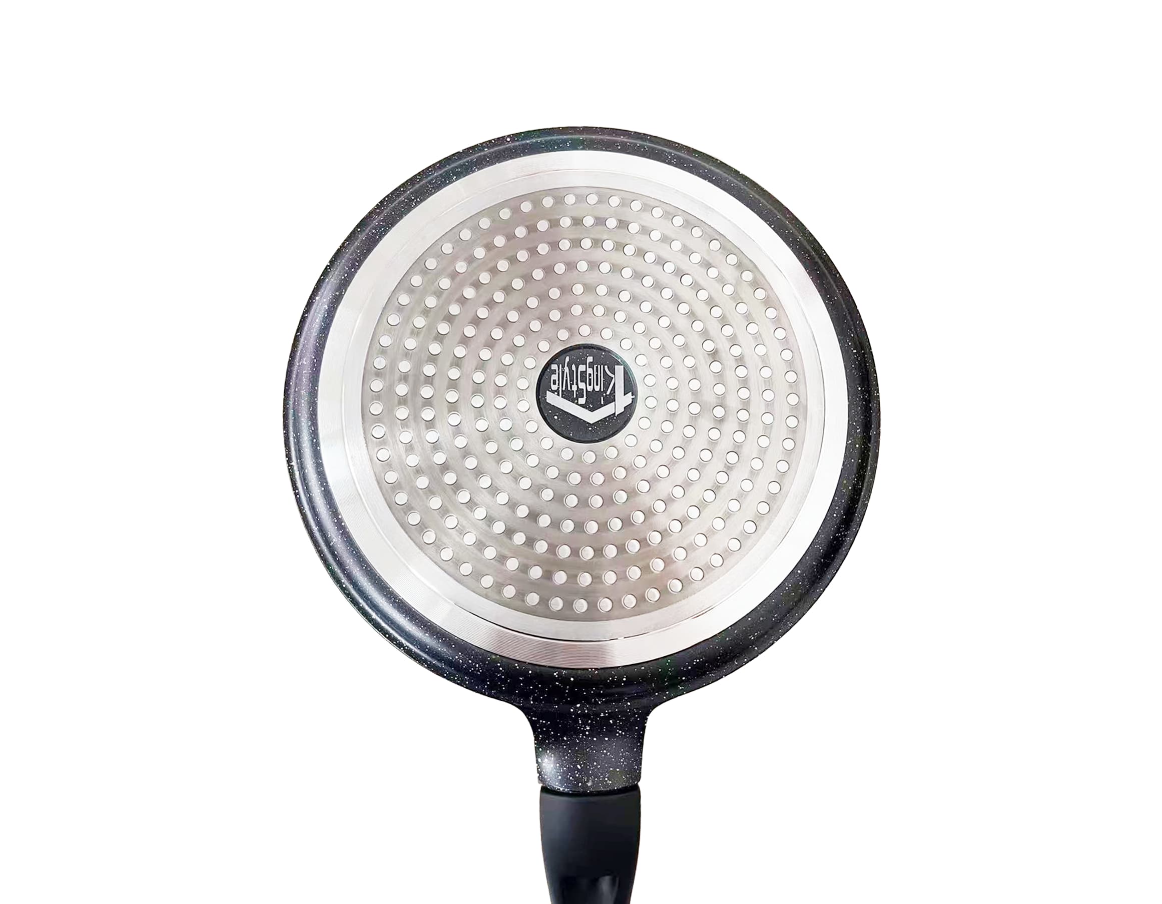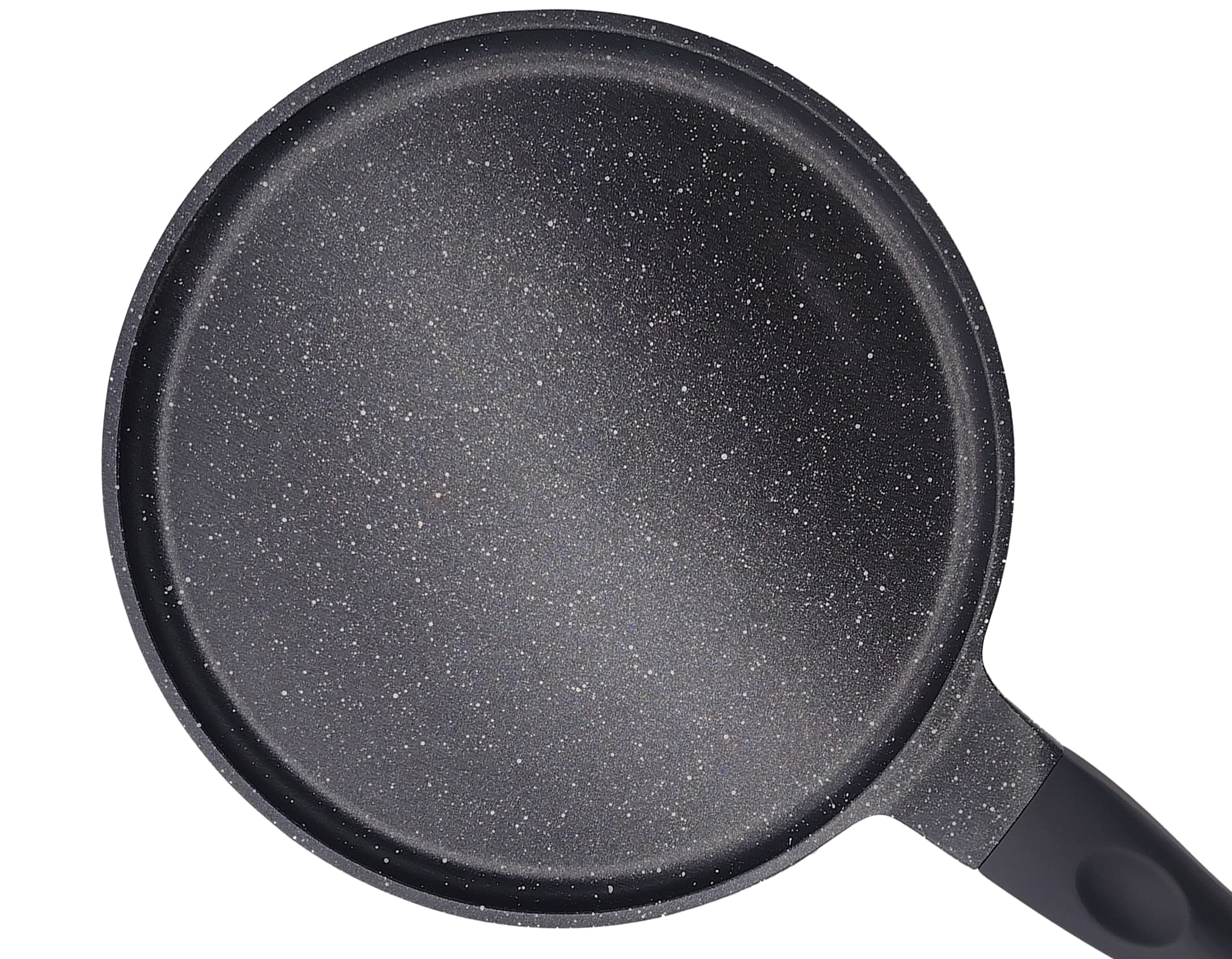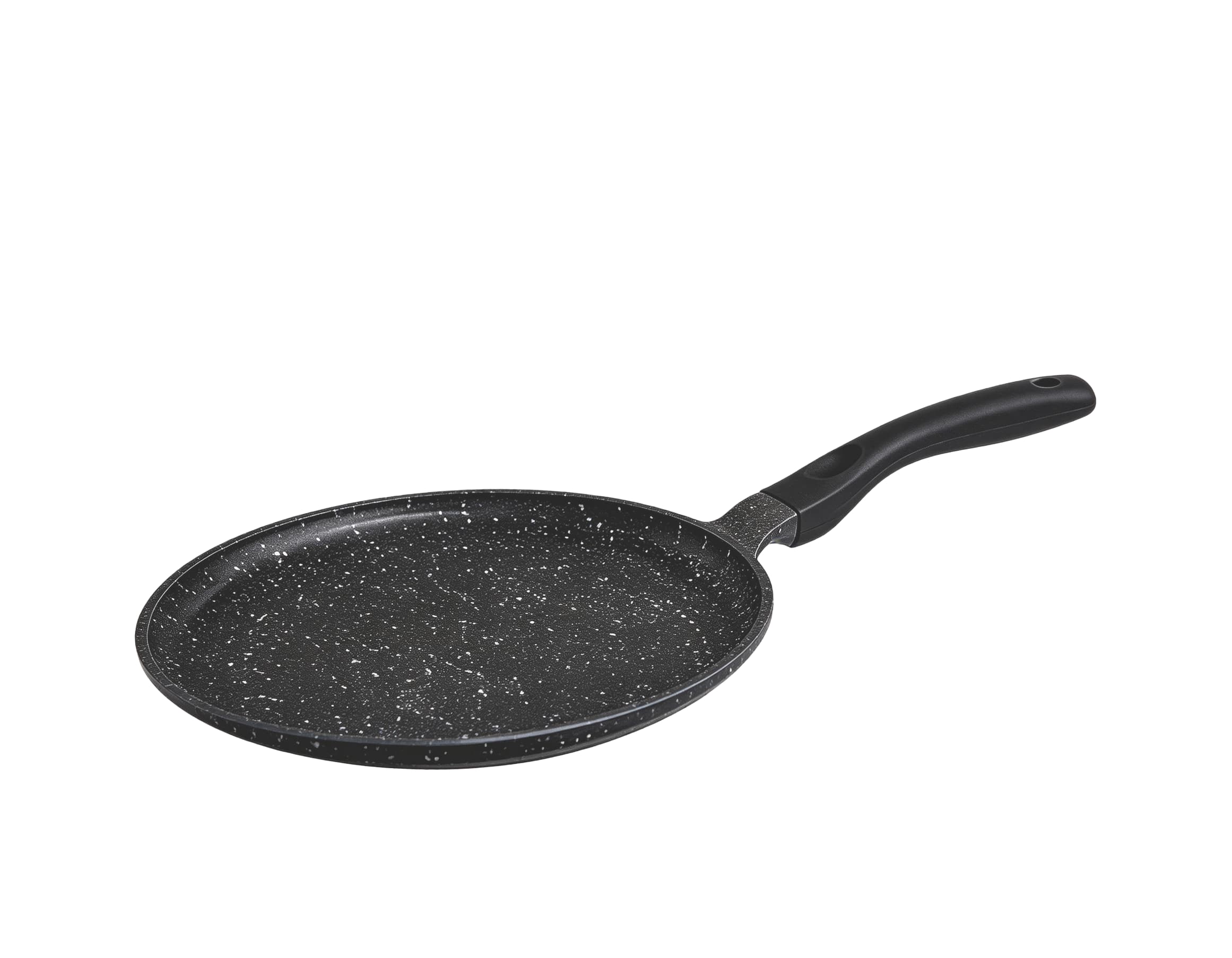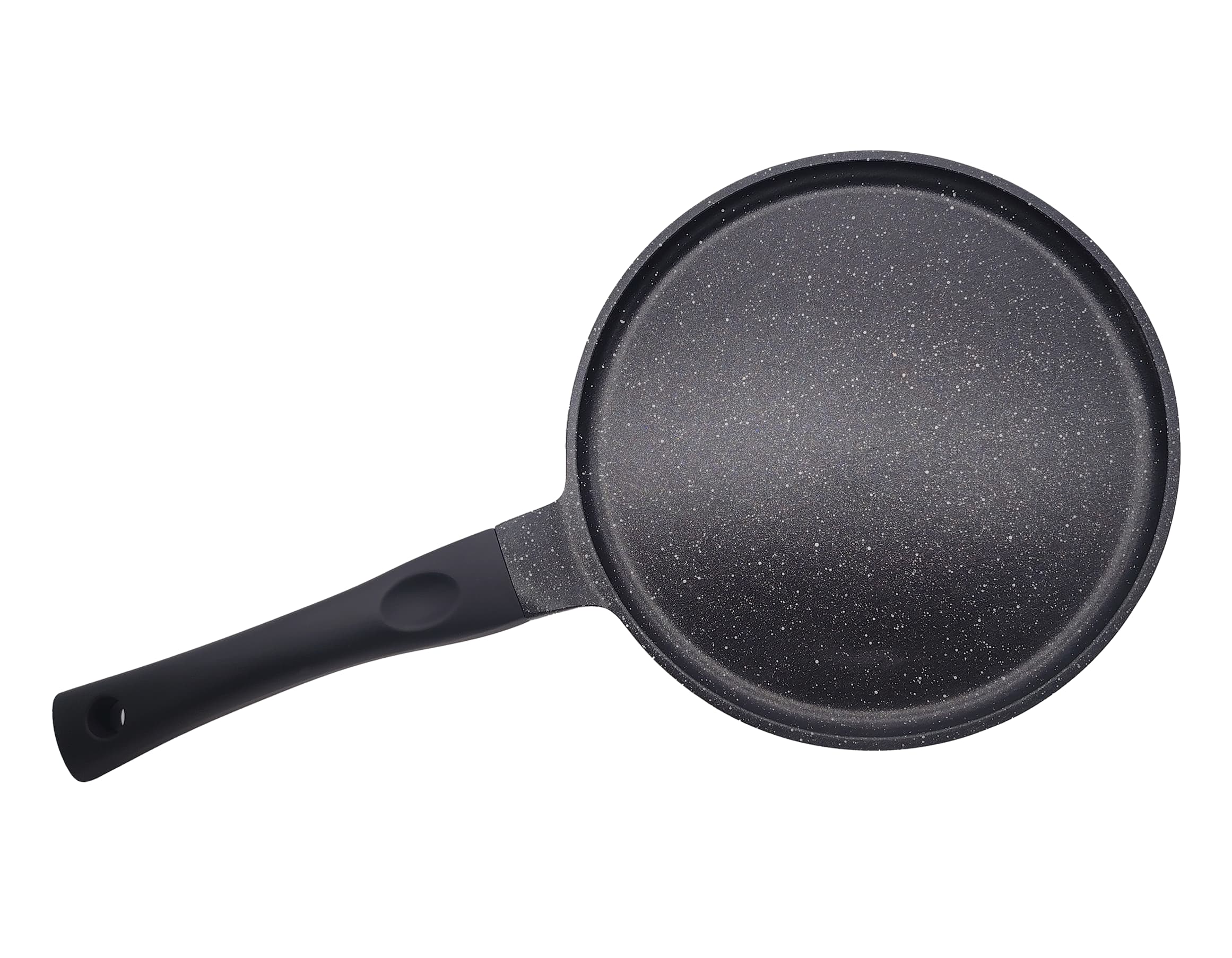 This 24cm die-cast aluminum pizza pan features a sleek speckled non-stick finish, combining durable construction with modern kitchen aesthetics. Equipped with an ergonomic heat-resistant handle, it ensures safe, comfortable handling while delivering even heat distribution. Its standard encapsulated induction base works on all stovetops, making it the ideal choice for baking pizza, pancakes, crepes, and flatbreads at home.