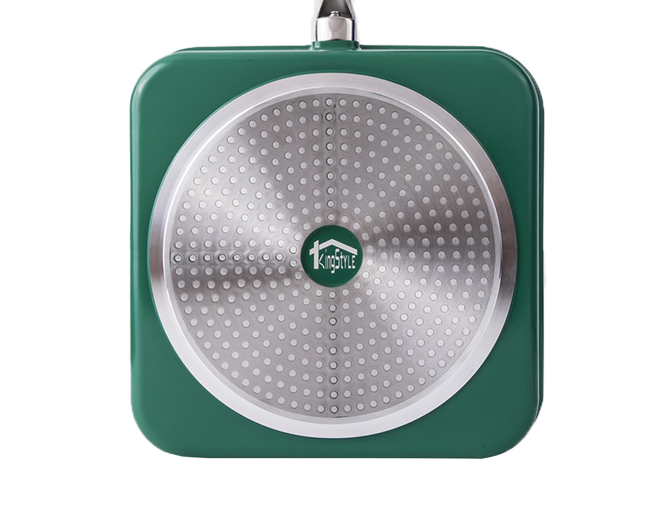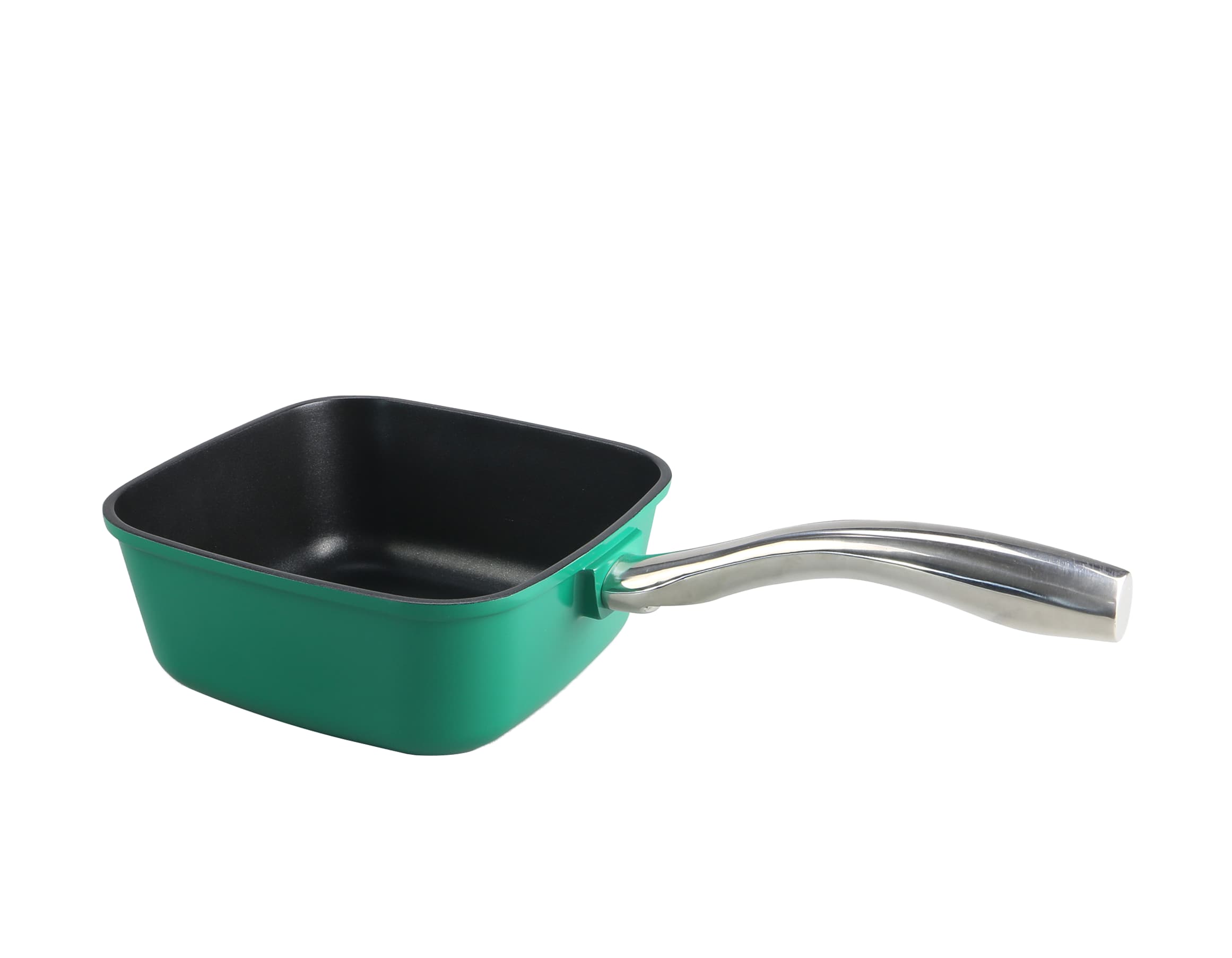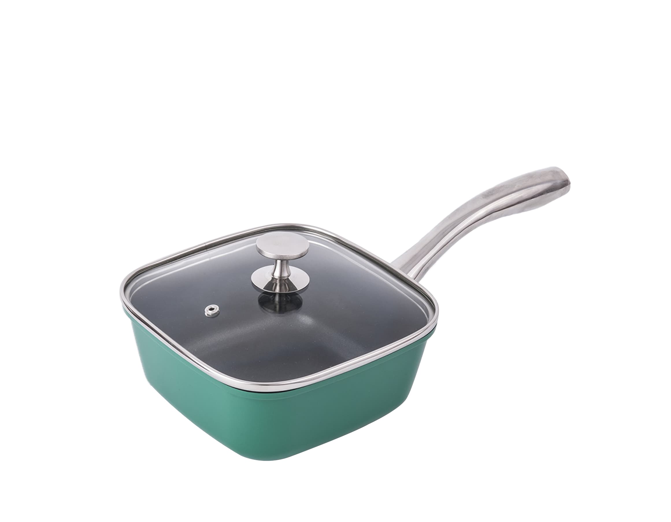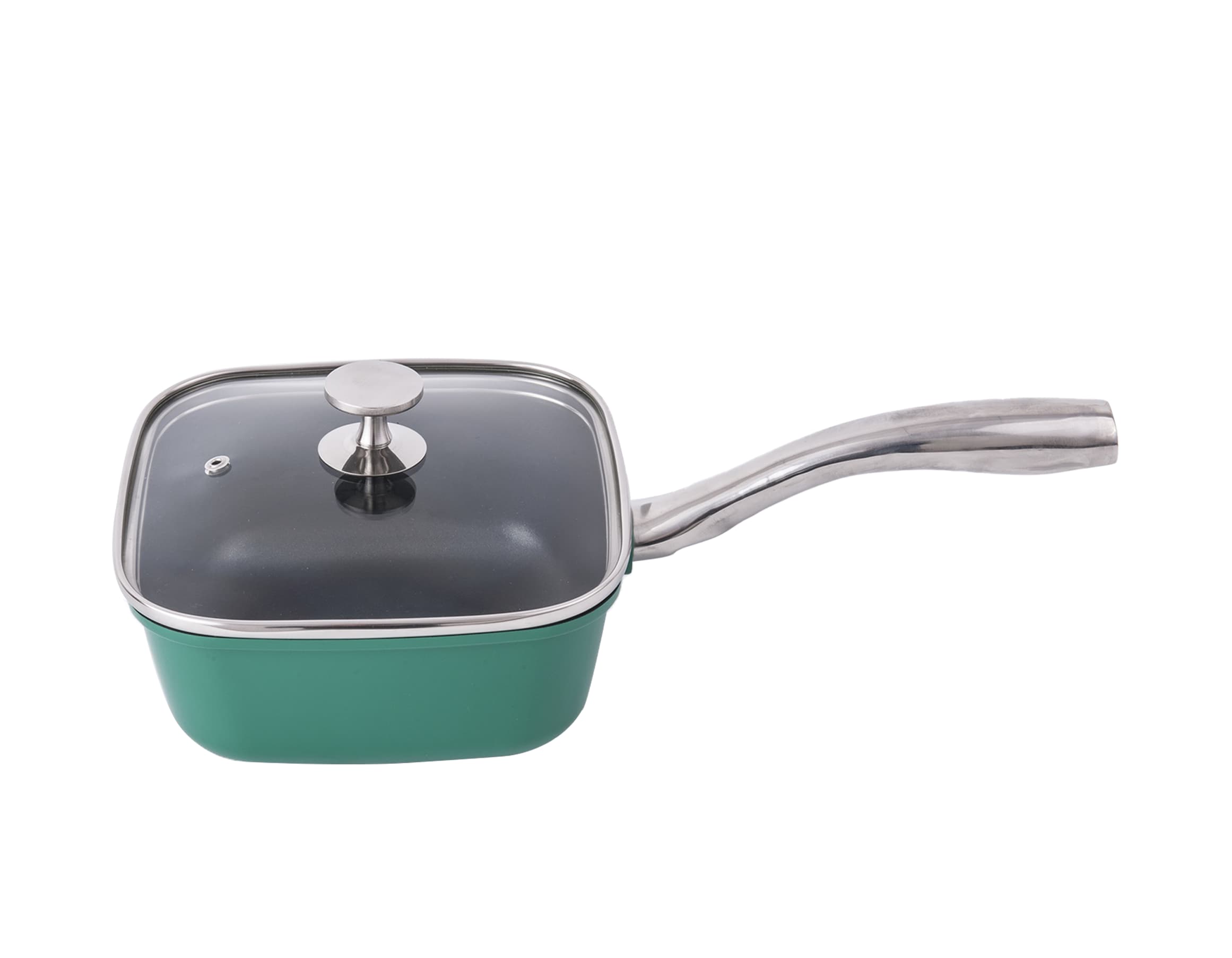 This 18×18cm die-cast aluminum square sauce pan features a vibrant green exterior and sleek non-stick interior, combining modern design with exceptional functionality. Equipped with an ergonomic stainless steel handle and a clear tempered glass lid, it ensures safe, comfortable handling while locking in flavor and moisture. Its standard encapsulated induction base delivers reliable heat distribution and works on all stovetops, making it the ideal choice for simmering, sautéing, and preparing small to medium meals.