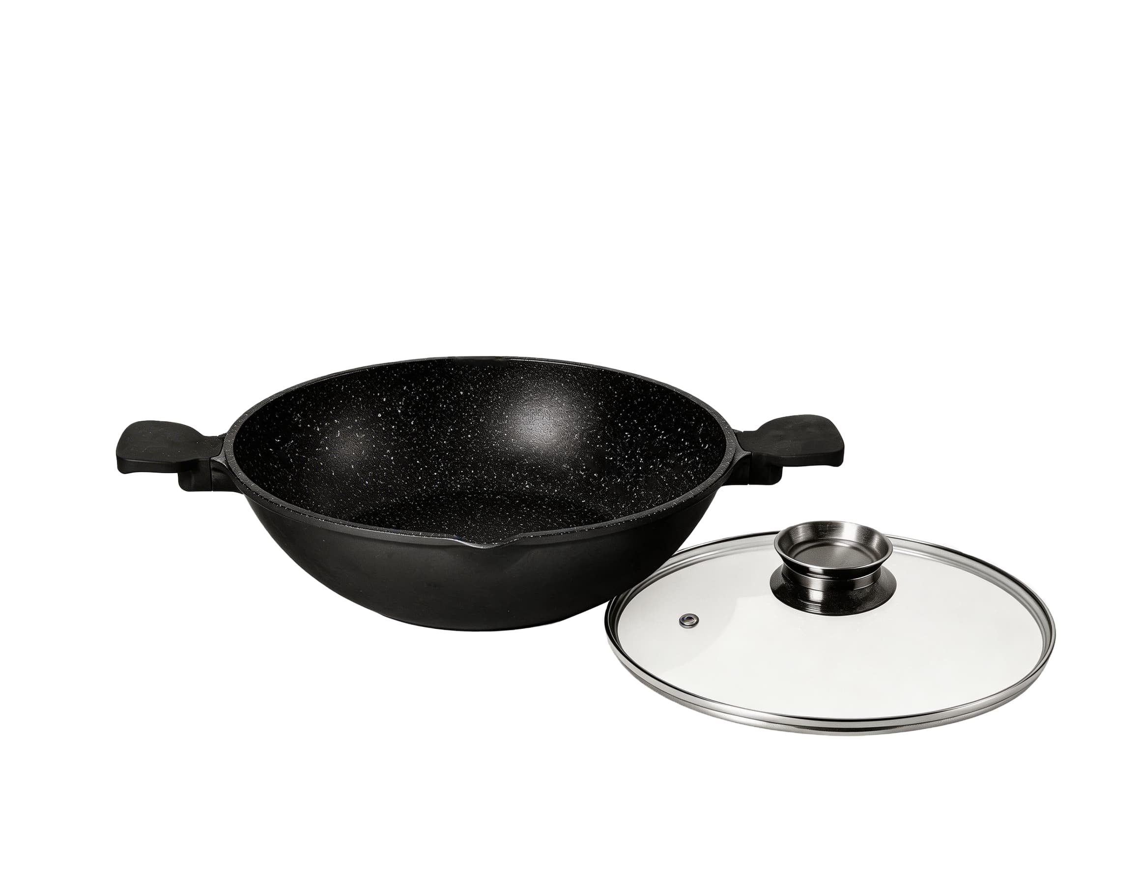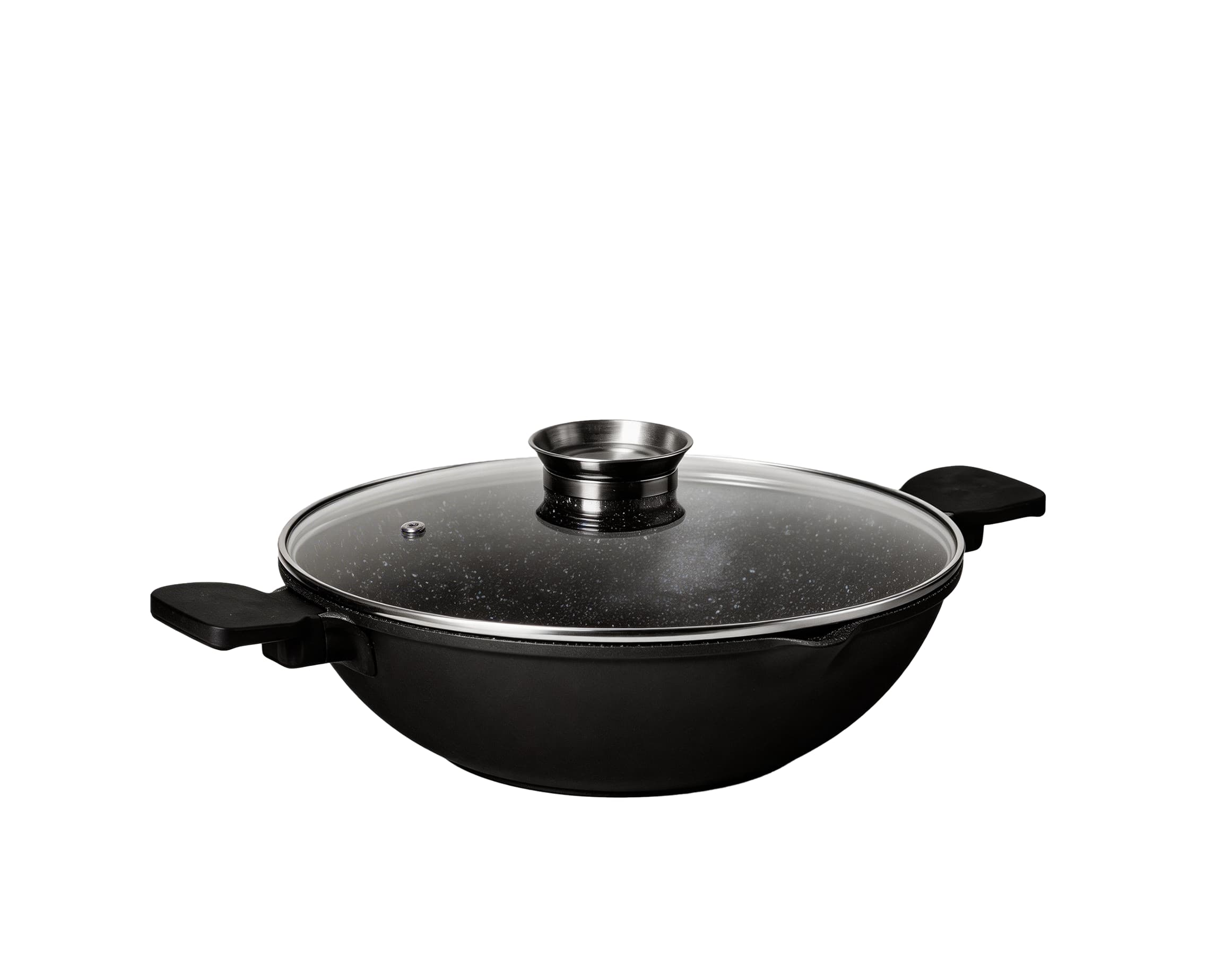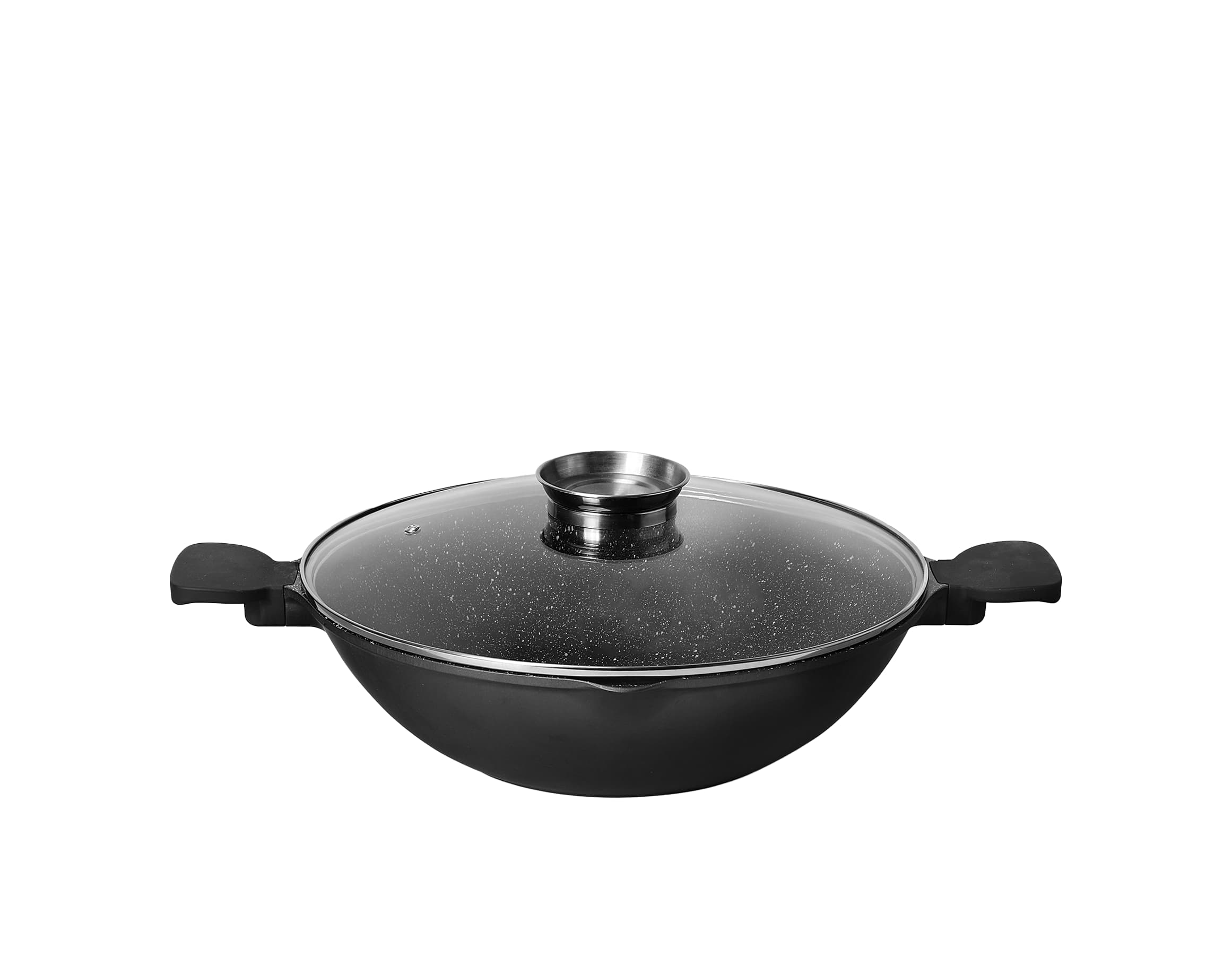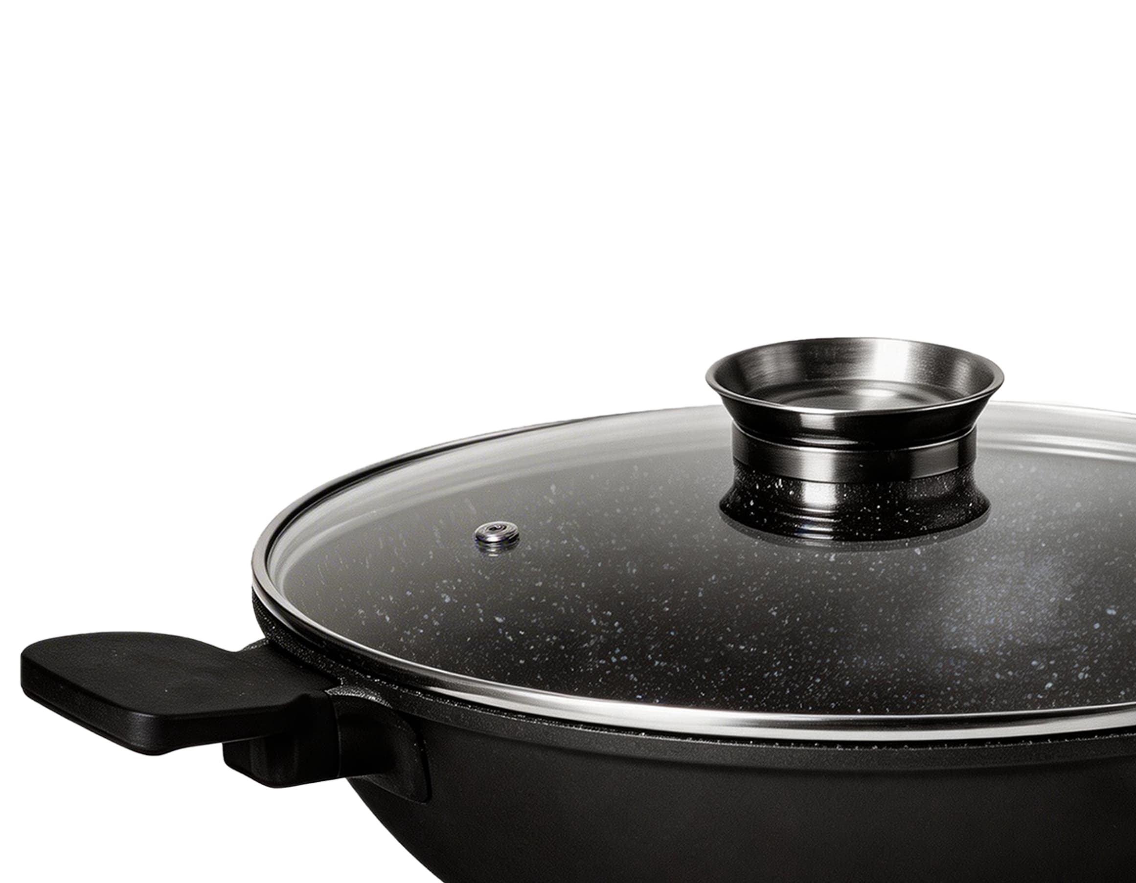 This premium die-cast aluminum wok features a striking granite finish, combining durability with modern aesthetics. Equipped with a tempered glass lid and ergonomic heat-resistant handles, it locks in flavor and moisture while ensuring safe, comfortable handling. It works on all stovetops, and with versatile sizes (32cm, 36cm), itโ€™s the perfect choice for authentic stir-frying, steaming, or preparing large family meals.