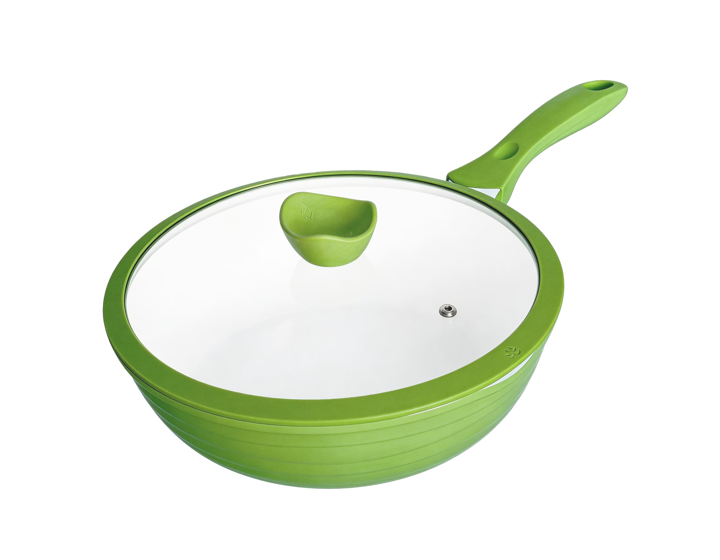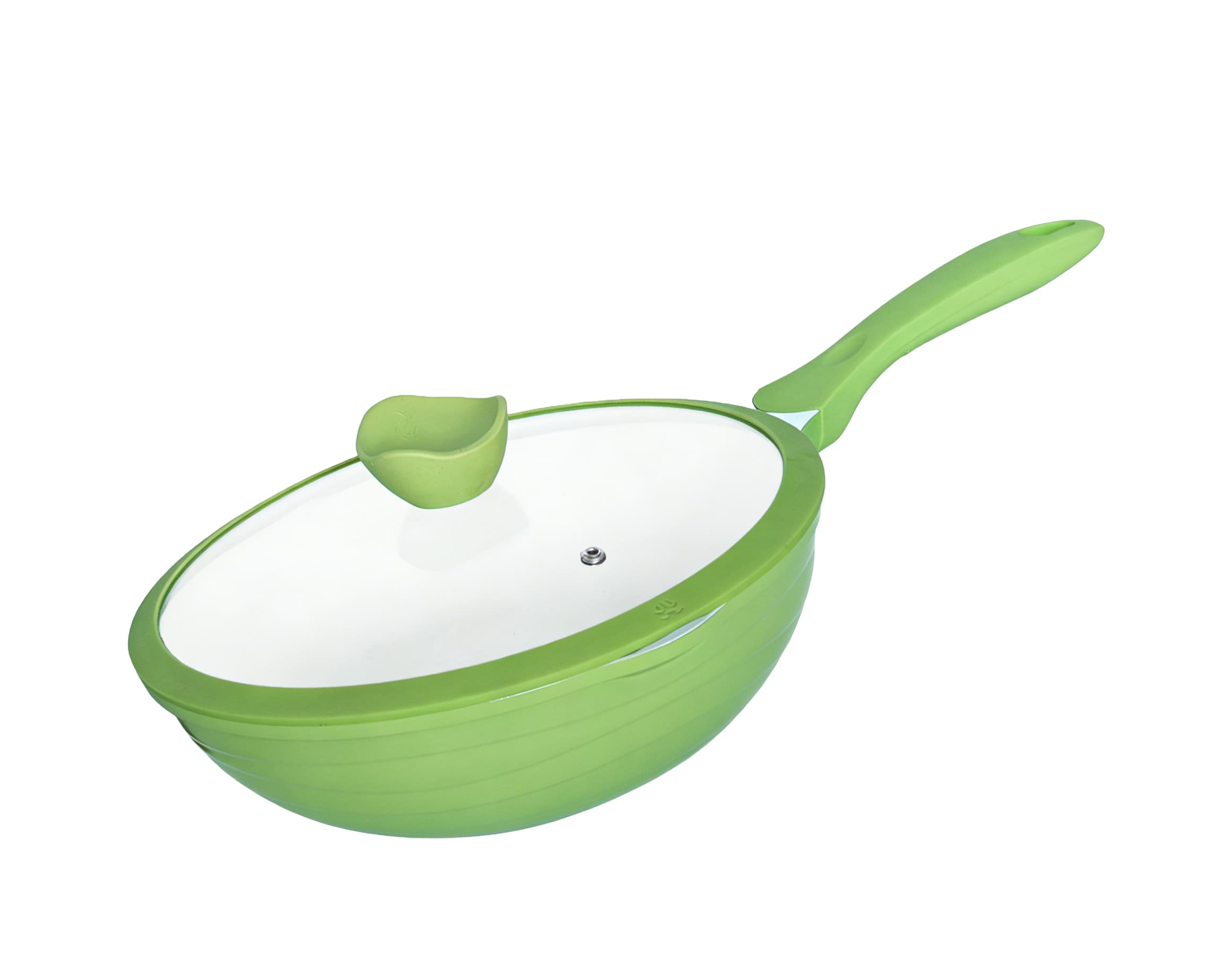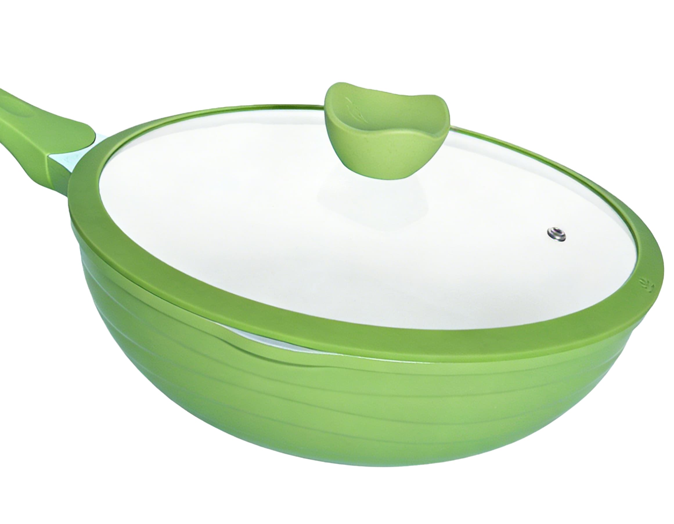 This 30cm die-cast aluminum wok features a sleek white non-stick interior and a vibrant green exterior, combining durability with modern aesthetics. Equipped with an ergonomic green handle and a clear glass lid, it ensures safe, comfortable handling while locking in flavor and moisture. Its reinforced induction-compatible base works on all stovetops, making it the perfect choice for stir-frying, braising, and preparing family-sized meals.