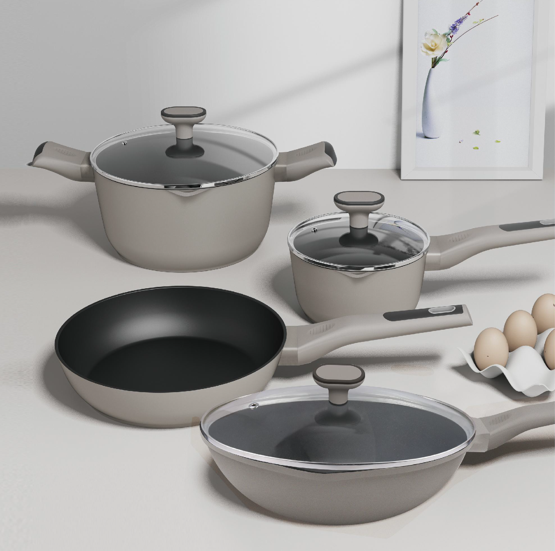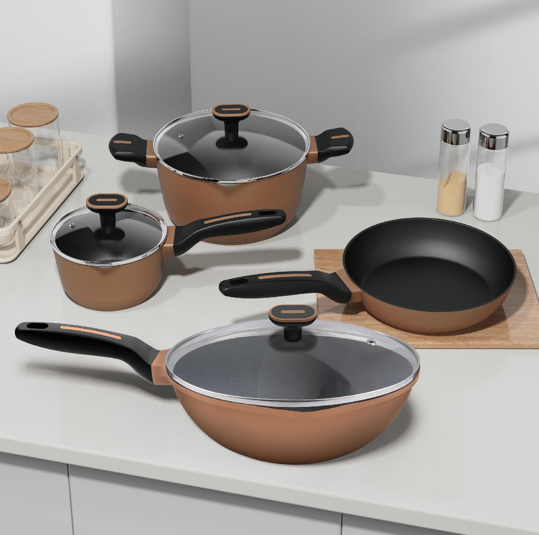 This comprehensive cookware set includes a sauce pan, casserole, fry pan, deep fry pan, square fry pan, and wok—all designed for versatile cooking. Each piece features a durable die-cast aluminum body with a standard encapsulated induction base for even heat distribution across all stovetops. The standout feature is its ergonomic, detachable handle system, which allows for easy storage and quick assembly, making it the ultimate space-saving kitchen companion.